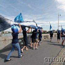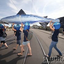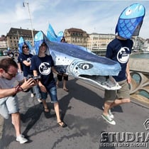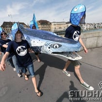 Eine Strassenaktion sorgt heute auf der Mittleren Rheinbrücke in Basel für Aufsehen. Gemeinsam mit Partnerorganisationen lanciert der WWF damit eine europäische Lachs-Kampagne. Das Ziel: Auch die letzten Kraftwerke am Oberrhein sollen so saniert werden, dass sie für Wanderfische passierbar sind.