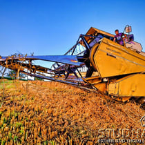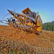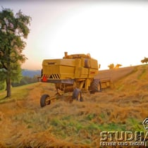 Landwirt Walter Budliger vom Erlosenblick in Sulz erntet mit seiner betagten Erntemaschine "Rosa" kurz vor Sonnenuntergang das steile Feld unser Nachbarn Ivo Winiger. Raffi Budliger begleitet seinen Vater, während Ivo und Claudia Winiger mit ihren Kindern Livia und Simon die Ernte vom Feldrand verfolgen.
