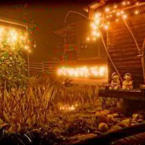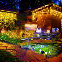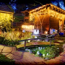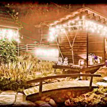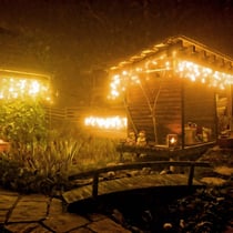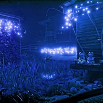Adventsdekoration, Weihnachtsbeleuchtung bei E.T. Studhalter privat in Sulz: Deko Eingang und Ställe mit Biotop.
