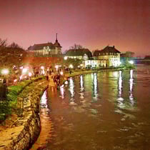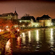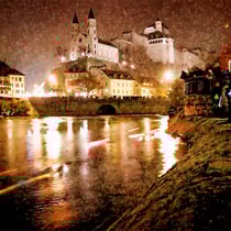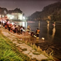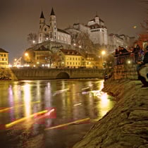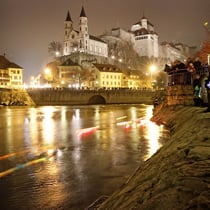 Lichterschwemme auf der Aare unterhalb der Festung Aarburg während Weihnachtsmarkt in der Altstadt und Festungsbazar.
