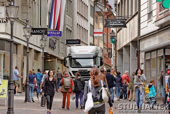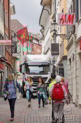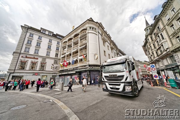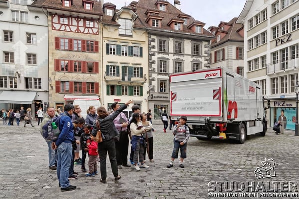 Bild: Das Elektrofahrzeug im Schritttempo von der Zentrale in Rothenburg unterwegs in die Luzerner Altstadt mit Chauffeur Stefan'Struppi' Straubhaar. Fotodokumentation Pistor AG, Bäcker-Konditor-Gastro-Service.