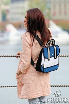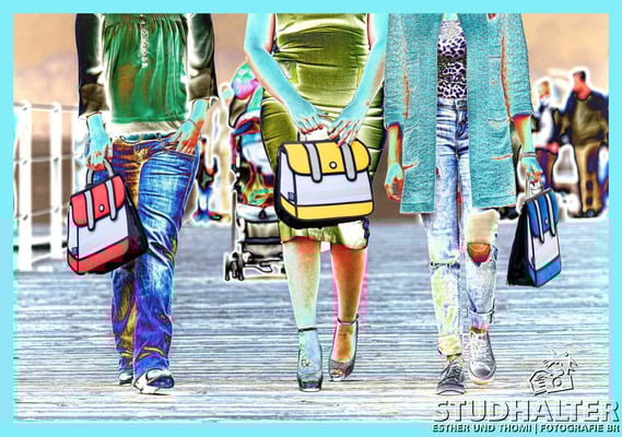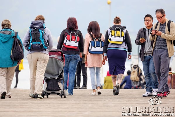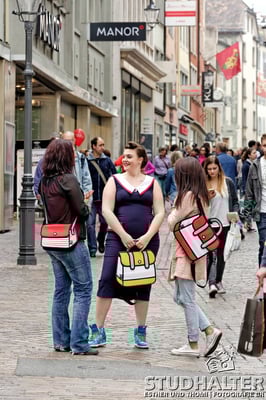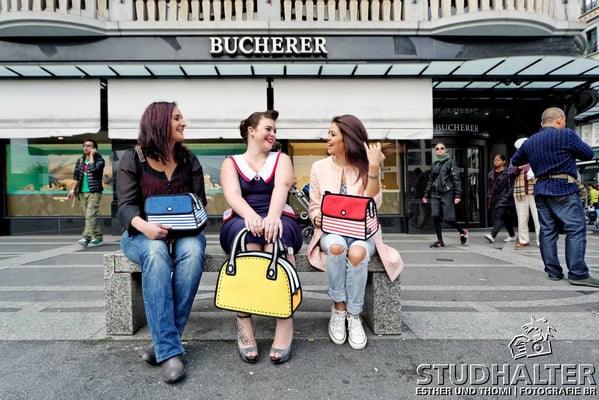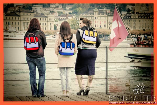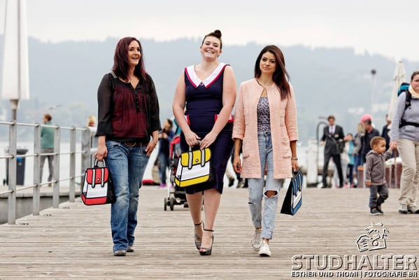 Exklusive Taschen der Marke 'Jump from Paper' fotografiert für Creativa und natura24.ch von Karin Sigrist, Aarau. Fotostandorte: KKL, HB Luzern Bahnhof, Seebrücke, Wasser, Kapellbrücke, Schwanenplatz, Falkenplatz, Weggisgasse, Rathaustreppe, Rathaussteg und Hauptbahnhof Luzern (Luzerner Altstadt). Mit Othmar Sigrist. und den Amateurmodels Nina und Sheena.