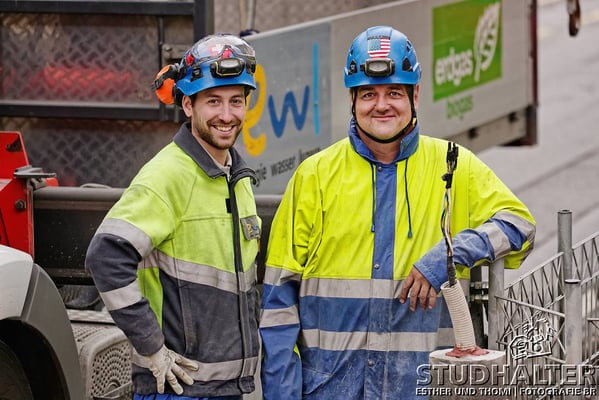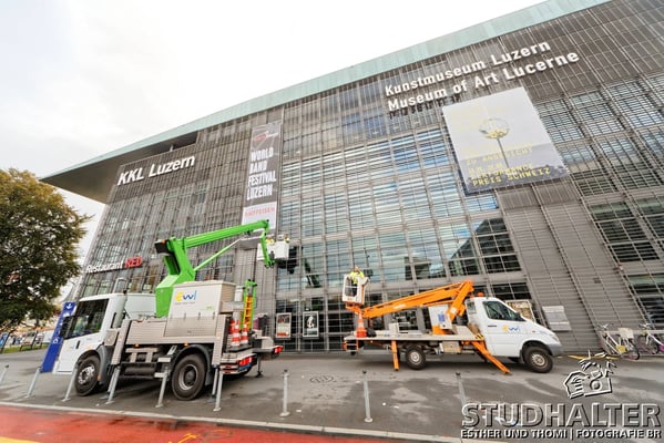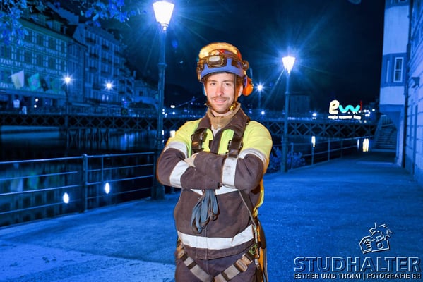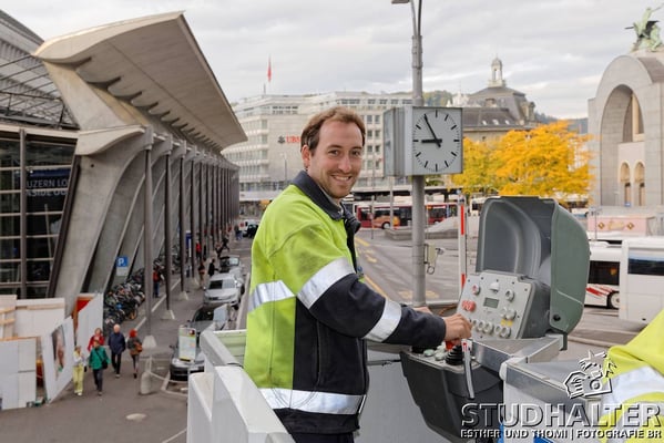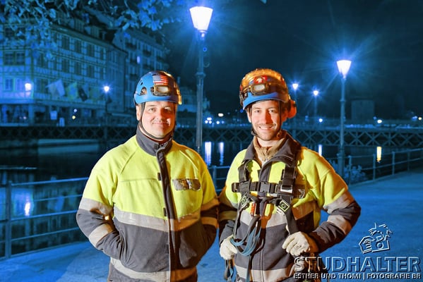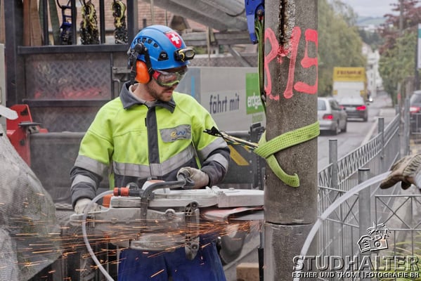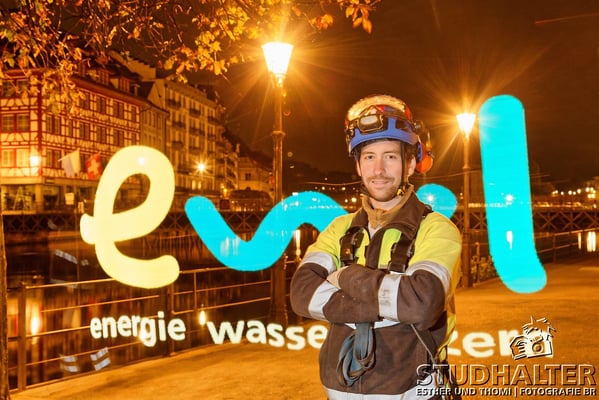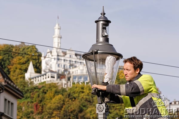Michael Brechbühl sorgt für eine sichere Strassenbeleuchtung in und um Luzern. Er ersetzt defekte Betonmasten an der Bernstrasse in Luzern: Die alten Betonkandelaber werden auf 1 Meter Höhe abgefräst und der neue Stahlkandelaber daruebergestülbt, ausgerichtet und mit Beton gefüllt. Während den verkehrsfreien Nachtstunden ersetzt er defekte Lampen der Strassenbeleuchtung in der Stadt Luzern, reinigt die von Mückenschwärmen verdreckten Leuchten entlang der Reuss setzt neue Leuchten. Reportage Rubrik 'Mein Job' ewl-Kundenmagazin FLUX 2-2015.