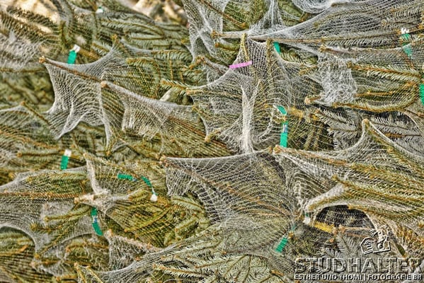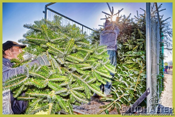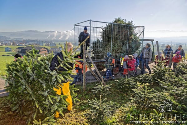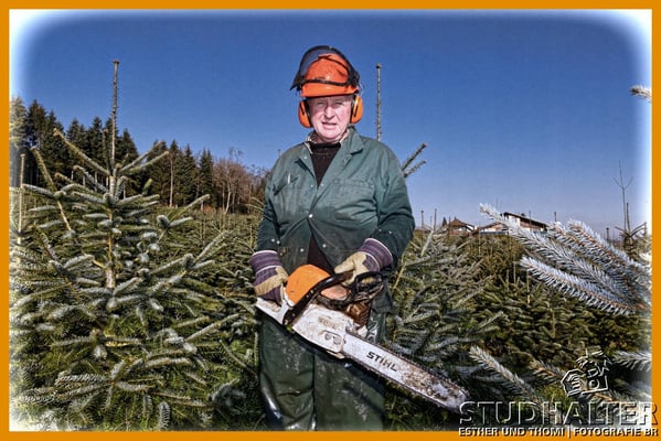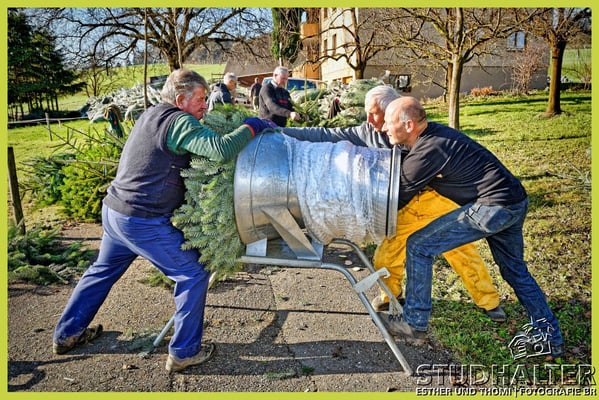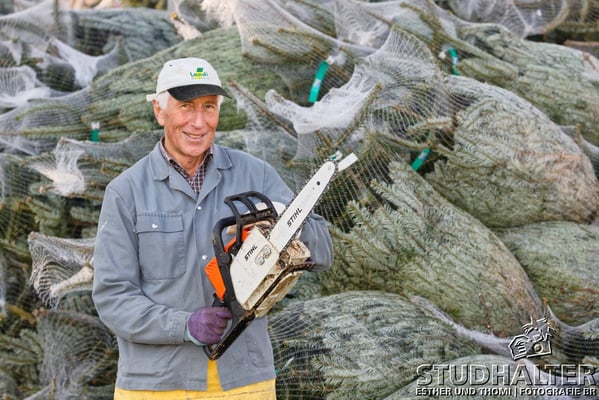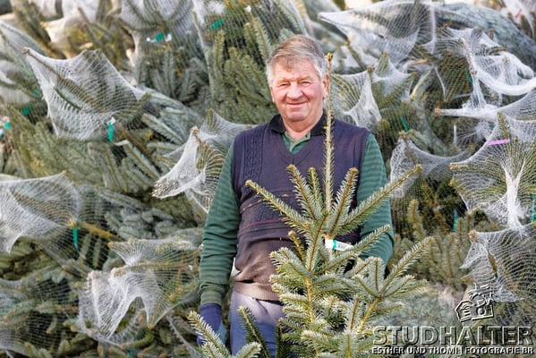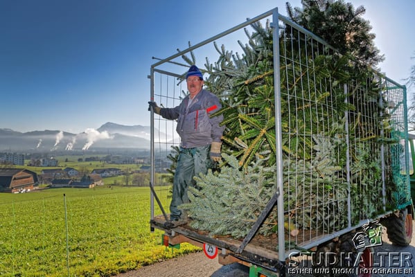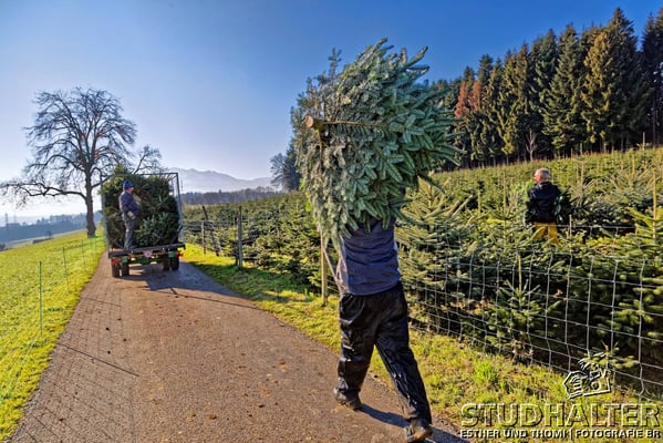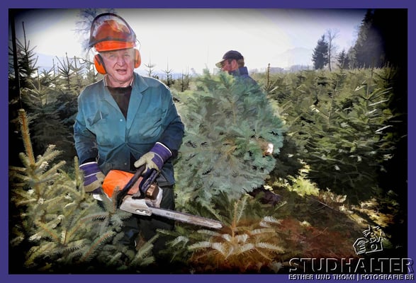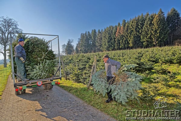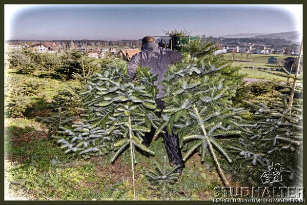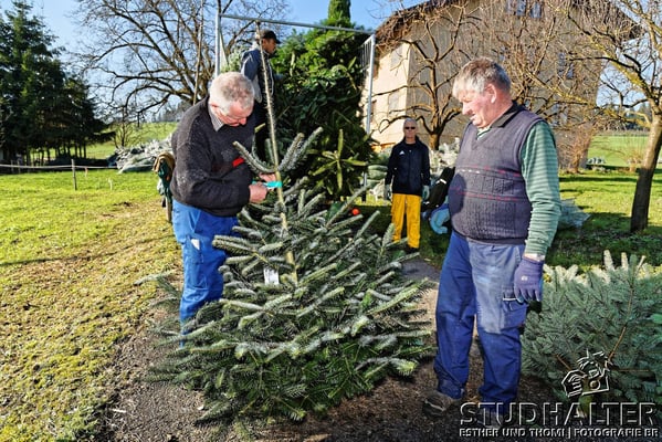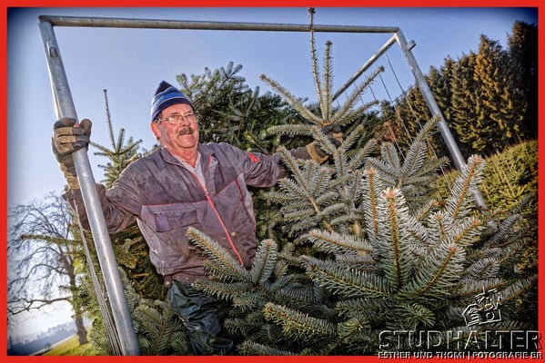 Christbäume 'Aus der Region - Fuer die Region', fotografiert mit und in der Christbaumschule von Albert 'Berti' Stirnimann in Eschenbach. Hochsaison in der Baumschule Eschenbach: Die Bäume werden nach Bestellung geschnitten und in Netze verpackt und an diverse Migros-Verkaufsstellen ausgeliefert.