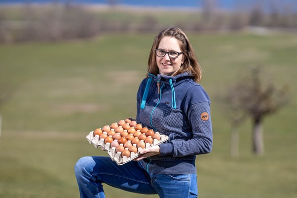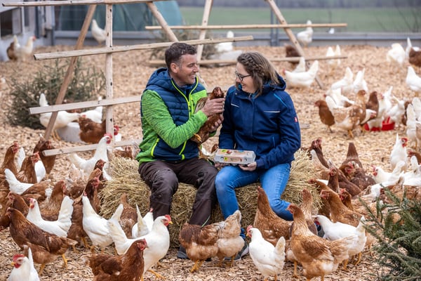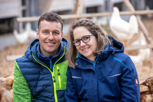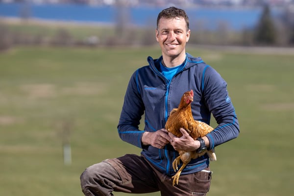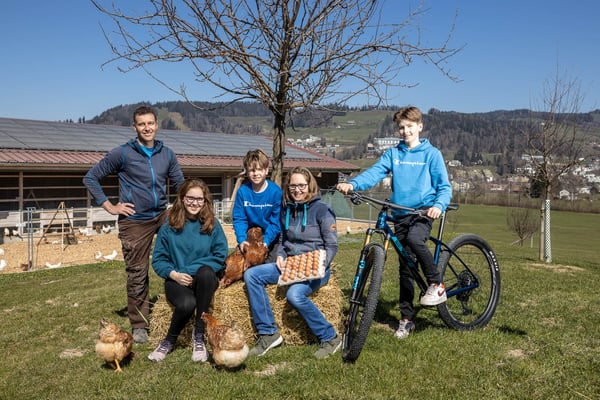 In dieser Idylle lässt sich gut gackern: Roland und Nicole Iten mit ihren drei Kindern, Maisbühlhof 1A in Unterägeri produzieren Bio-Eier für die Migros Luzern. Moderner Hühnerstall mitsamt Wintergarten und viel Freilauf. Aus der Region - Fuer die Region Migros Luzern.