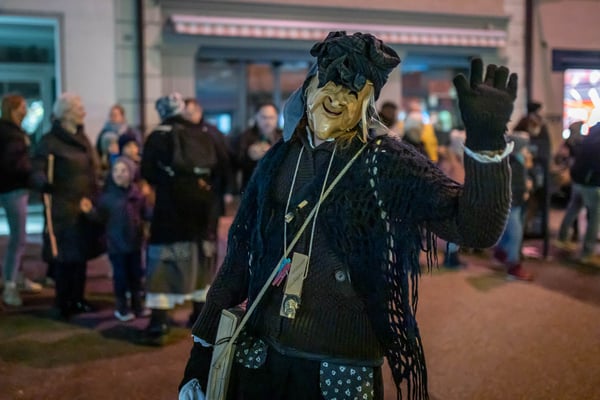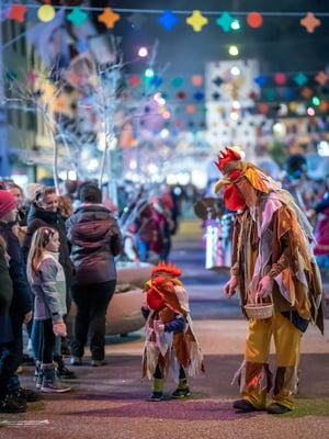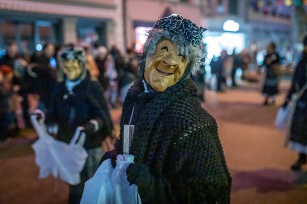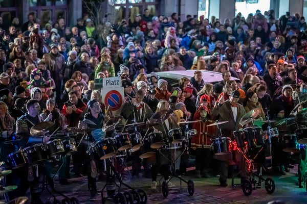 Im Anschluss stellt Speaker Marc Lustenberger die jubilierenden «Let's Fetz» (30 Jahre) vor und gratuliert der 30-köpfigen Formation unter Tambine Adriana Hügi und Präsident Alexander Kathol unter grossem Applaus der fasnächtlich Versammelten. Unter diesen befindet sich auch Reto Mehr. Ein dreifaches Gelöbnis abgegeben, wird er in die Karnöffelzunft aufgenommen. Mit Gian Wyss und Jeremias Müller können auch zwei neue Gesellen begrüsst und zum Gelöbnis gebeten werden. Zum Abschluss lassen fetzige Guuggerklänge den Kirchenplatz erbeben.