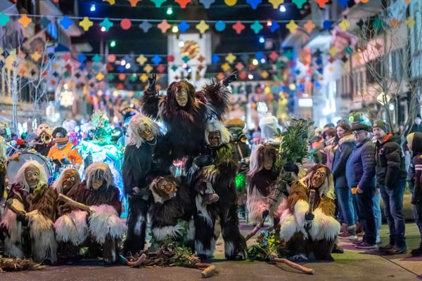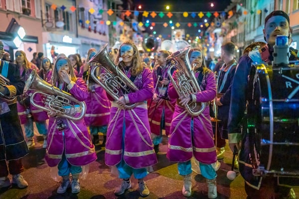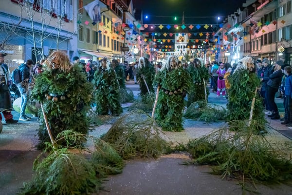 Freitag, 18.50 Uhr, Postplatz-Untertor. Einzelne Posaunenschränzer und Sousafonbrummer tönen in den konfettigeschmückten Nachthimmel. Nervöses Warten auf den Beginn des Einzugs macht sich breit. Und dann der schaurige Eröffnungsknall. Los gehts wie im Drehbuch festgehalten. Mit den jubilierenden «Let's Fetz» (30 Jahre), gefolgt von der kaffeeverteilenden «Güggali-Zunft», den «Ringligüüssern» und den «Wegere Güüssern» mit schaurig schönen Stücken. Die «Wöschwyber» schwenken die Wäsche, die «Schlössliruugger» schränzen, was das Zeug hält, die Enzilochmannen chreesen daher, während das gfürchige Stadttier und dessen Wächter dem Zunftmeisterpaar Anita und Rainer Thüer mit den Zünftigen und Gesellen den Weg bahnt. Den Abschluss des farbenprächtigen Korsos bilden die «Cityschränzern Gättnou», den «Moorsträggele» und schliesslich den virtuos aufspielenden «Napfruugger». Dies alles vor einem vielhundertköpfigen Publikum, das beim Kirchenplatz mitklatschend und -fiebernd das närrische Geschehen verfolgt.