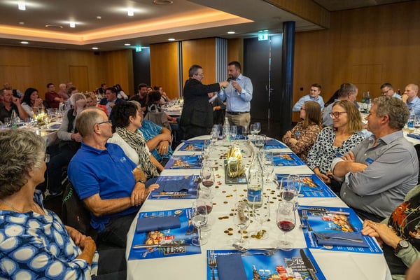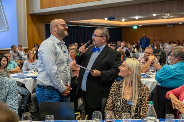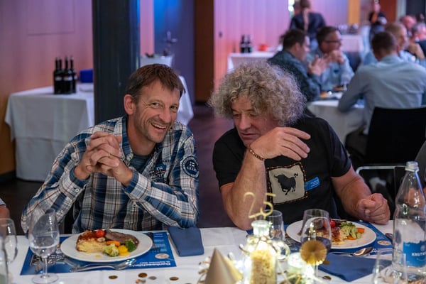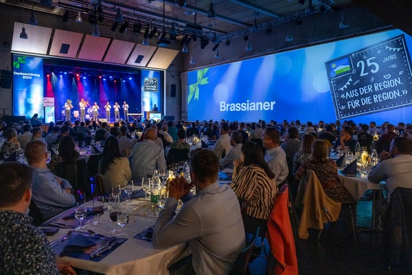 AdR-Wegbegleitenden und ihren Botschaftern – Mundartsänger KUNZ und Schwingerkönig Joel Wicki – im Kulturzentrum Braui in Hochdorf. Zum 25-jährigen Jubiläum erhielten alle AdR-Betriebe symbolisch
