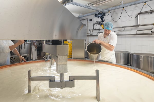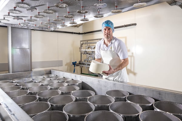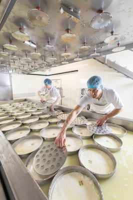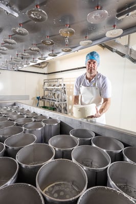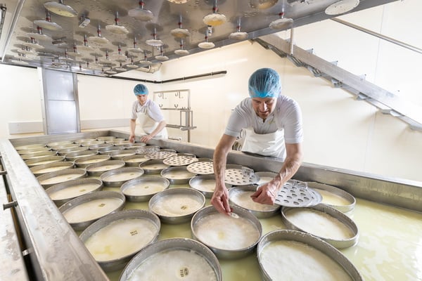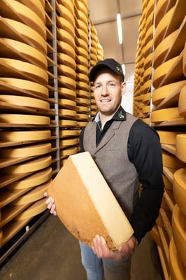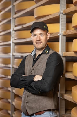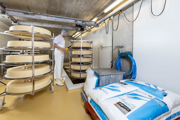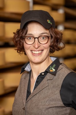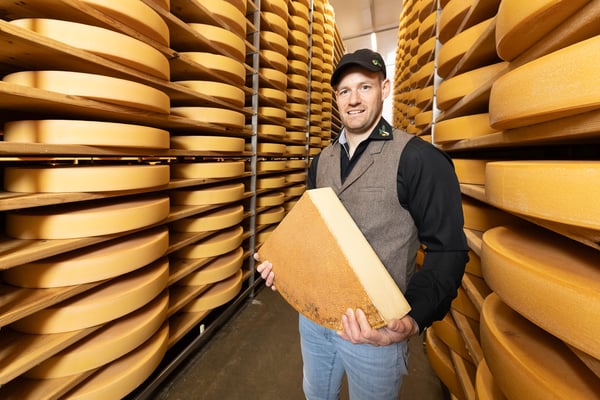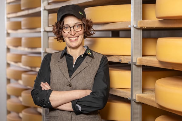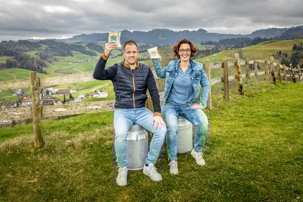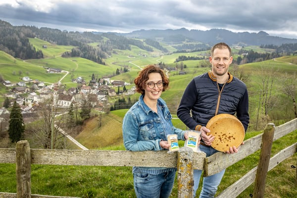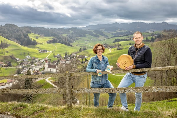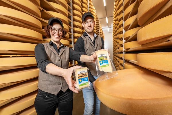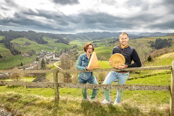 LUTHERN/LU - 31. MÄRZ 2025 - MIGROS LUZERN AdR NAPF-CHÄSI: Elmar Lustenberger (Leiter Fabrikation, QS, Käsermeister, Geschäftsleitung) und Karin Schwegler (Leiterin Verkauf Chäshuus Triengen, Events, Geschäftsleitung), fotografiert in der Produktion Luthern, im Reifekeller Hofstatt und in der Napfberglandschaft hoch über Luthern. Aus der Region - Für die Region.