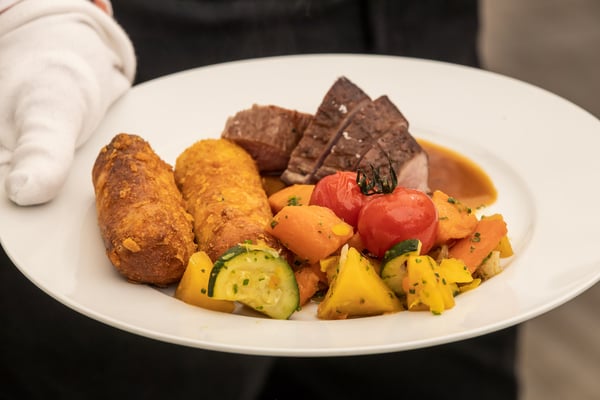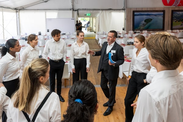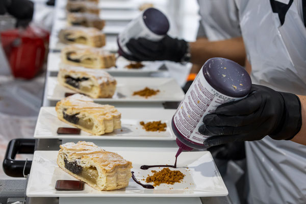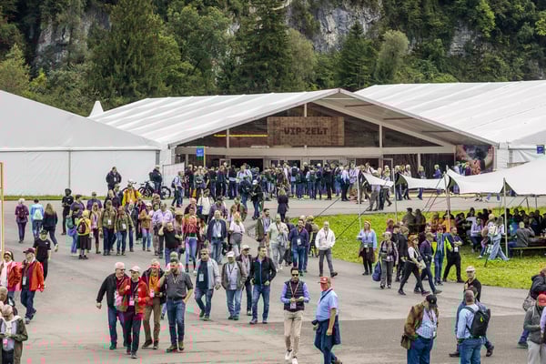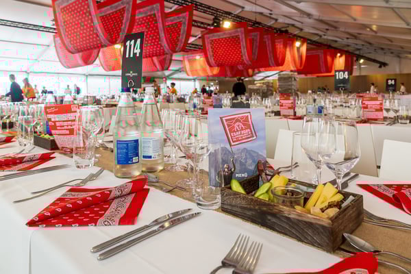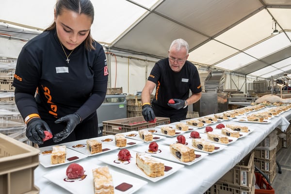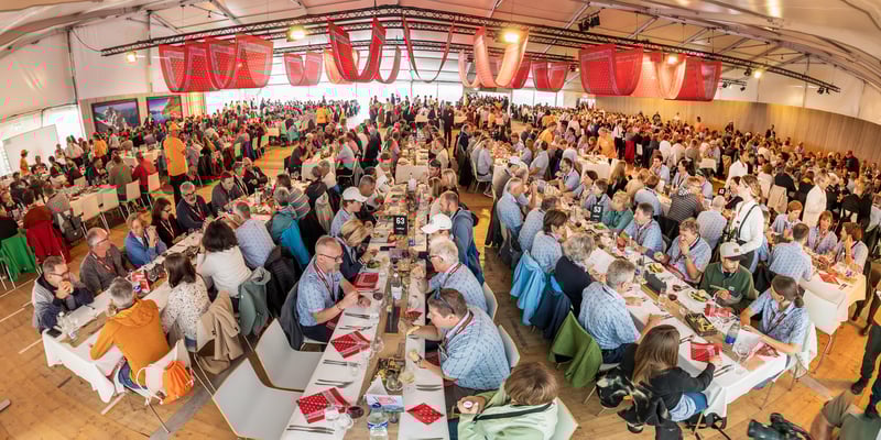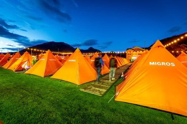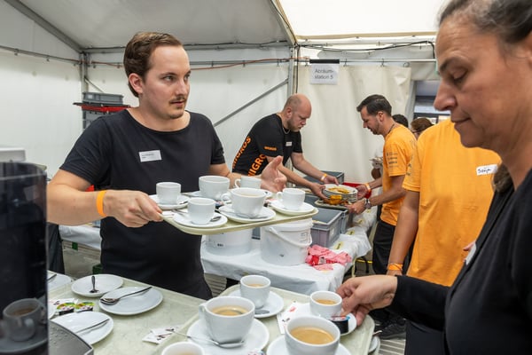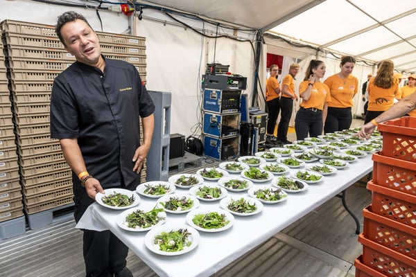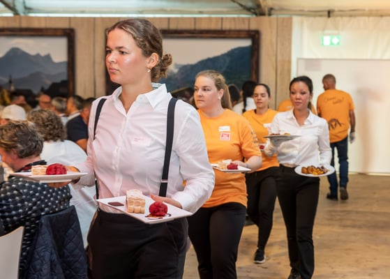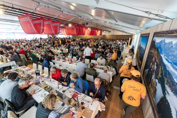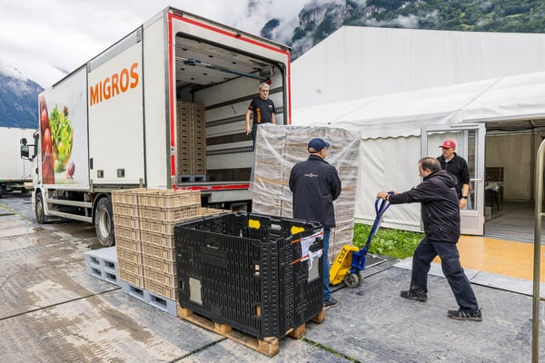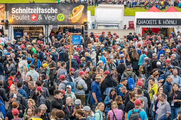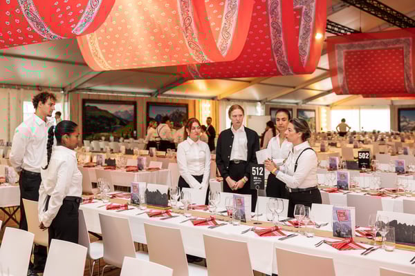 Den 56'400 Besucher:innen in der riesigen Schwingarena am Eidgenössischen Schwing- und Älplerfest in Mollis/GL bleibt in der Mittagspause zwischen den Gängen nur wenig Zeit für die schnelle Mittagsverpflegung. Entsprechend riesig der Aufwand für die Catering Services der Genossenschaft Migros Zürich: Hunderte Service-Mitarbeiter:innen und Dutzende Köch:innen in den diversen Küchen sorgen für eine speditive und trotzdem qualitativ hochstehende Verpflegung der rund 4'000 VIP-Gäste in mehreren Festzelten. Die Apéro-Häppchen aus der Region warten bereits auf den Tischen auf die unregelmässig eintreffenden VIPs. "Food-Runners" bringen Vorspeise, Hauptgang und Dessert, während ein Heer von Service-Profis die Gäste begrüsst, an ihre Tische begleitet, betreut, den Getränkenachschub sicherstellt und fortwährend abräumt.