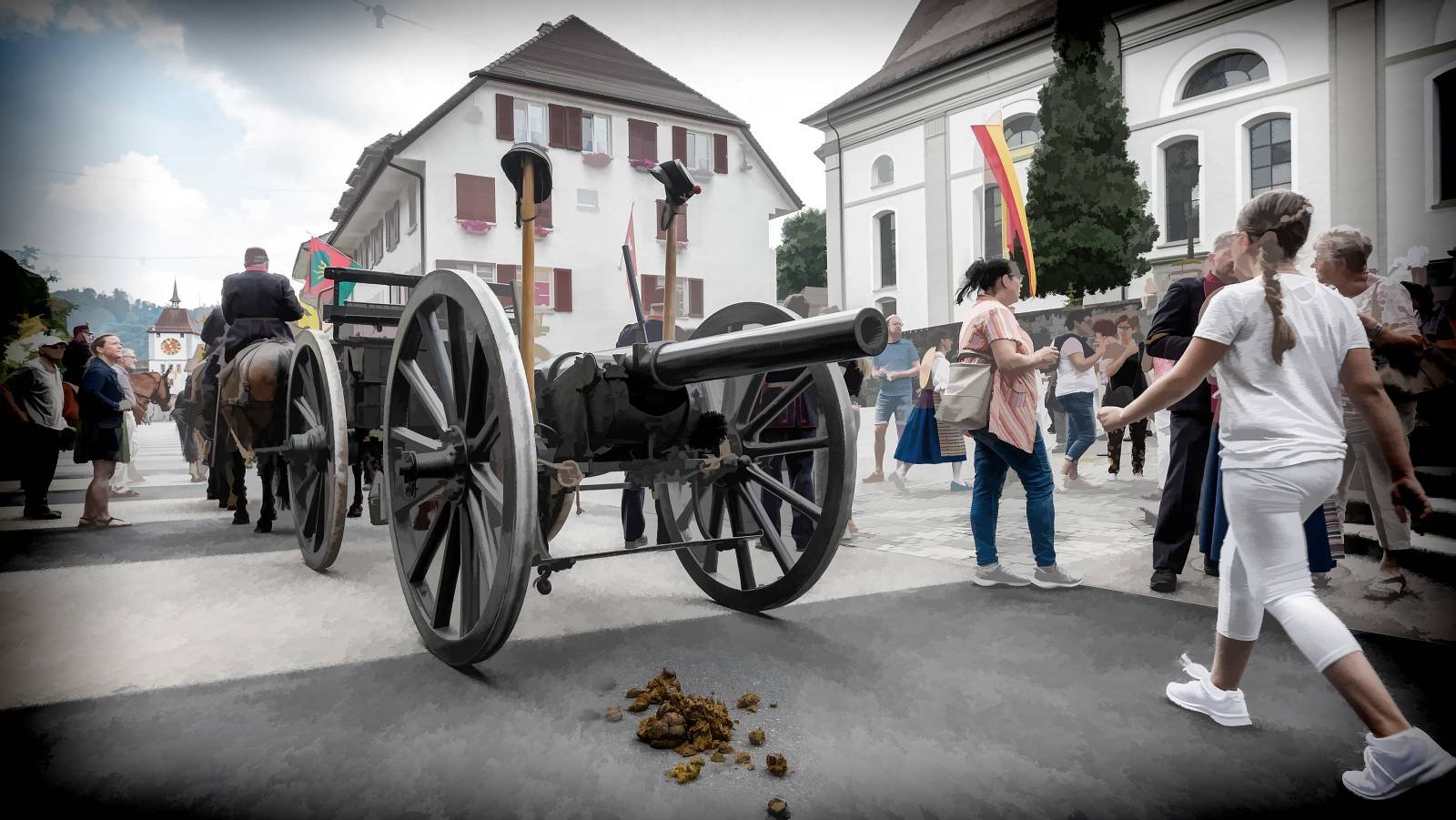 Impressionen Prozession zu Ehren der Heilig-Blut-Kapelle im Städtchen Willisau. Heiligblut-Legende: Hauptdarsteller drei Spieler / Der Eine verlor sein ganzes Geld und stiess fluchend sein Schwert in die Luft, um den Leib Christi zu durchbohren / Fünf Blutstropfen fielen sogleich auf den Tisch / Der Gotteslaesterer wurde vom Teufel geholt / Die beiden anderen erlitten einen schrecklichen Tod. Frueher stark besuchter Wallfahrtsort.