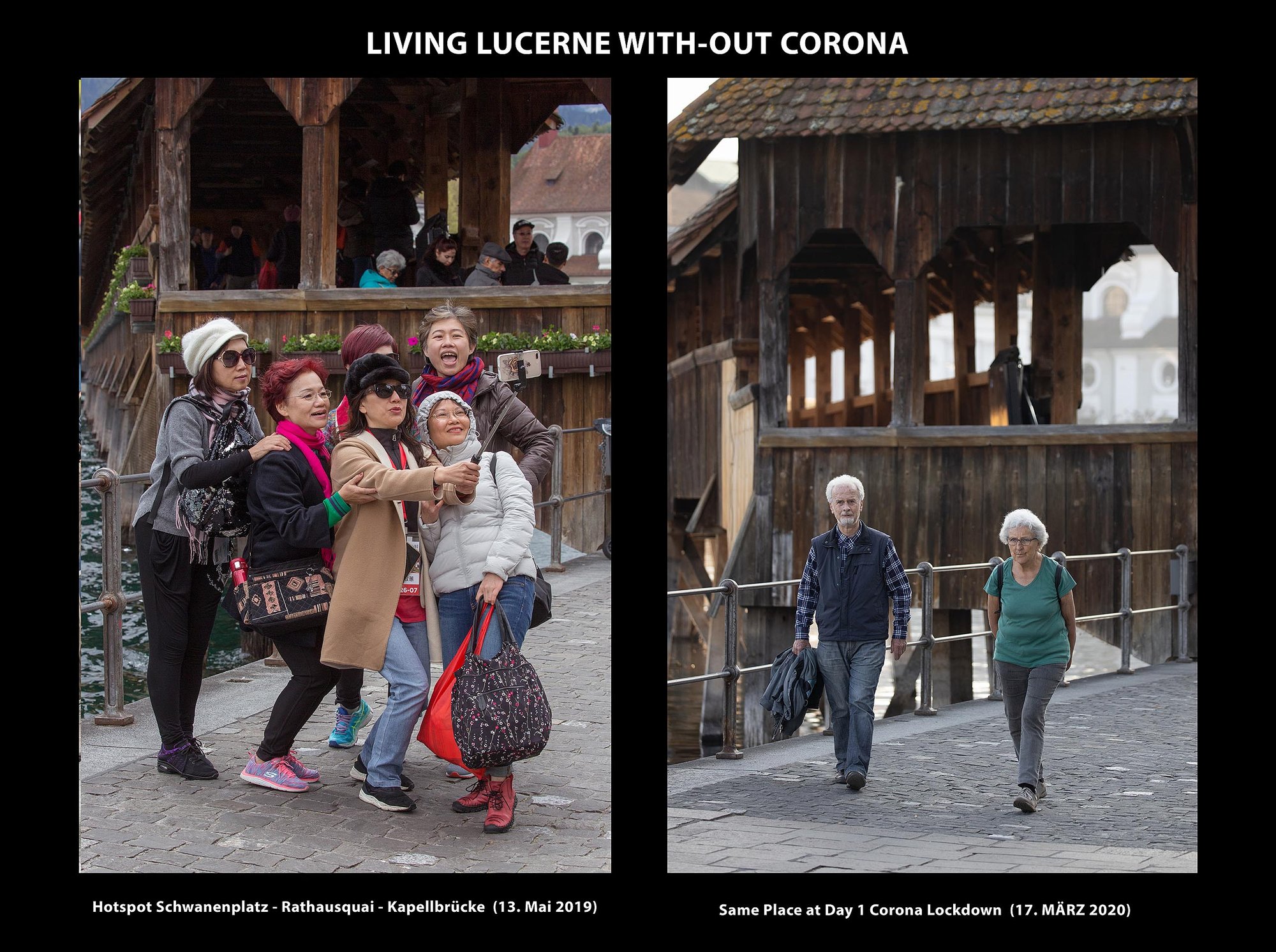Unglaublich, wie schnell sich mensch sogar an massive Veränderungen des Alltags gewöhnt: gab's für Einheimische noch vor wenigen Monaten kaum ein Durchkommen an den touristischen Hotspots Luzerns, so waren am 1. Tag des Lockdowns fast ausschliesslich Luzerner in der Stadt anzutreffen.